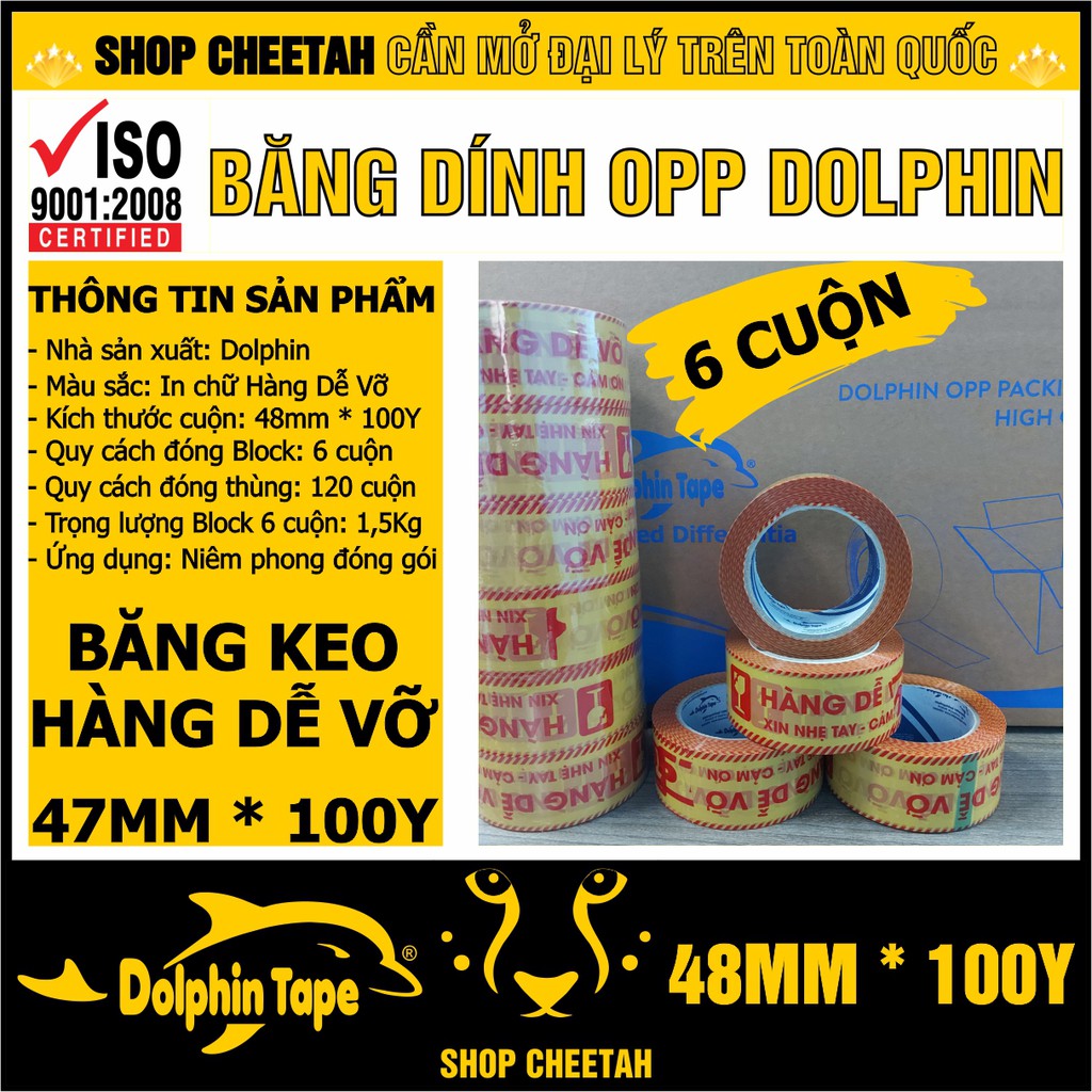 6 Cuộn [ HÀNG DỄ VỠ ] Băng dính in chữ quy cách 48mm x 100Y – Nhãn hiệu Dolphin – Dùng đóng gói cho hàng hoá chú ý khi vận chuyển