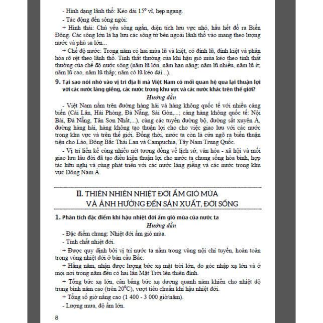 Các câu hỏi và bài tập được biên soạn theo mức độ từ thấp lên cao, trong đó chú trọng các câu hỏi yêu cầu vận dụng và vận dụng cao. Ngoài các câu hỏi và bài tập bám sát kiến thức cơ bản còn có các câu hỏi nâng cao, mở rộng tri thức và kĩ năng nhằm phát triển năng lực tìm hiểu kiến thức địa lí, vận dụng kiến thức và kĩ năng vào thực tiễn.