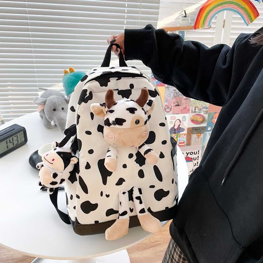 Balo bò sữa cao cấp họa tiết bò sữa (Kèm móc khóa bò sữa cute )