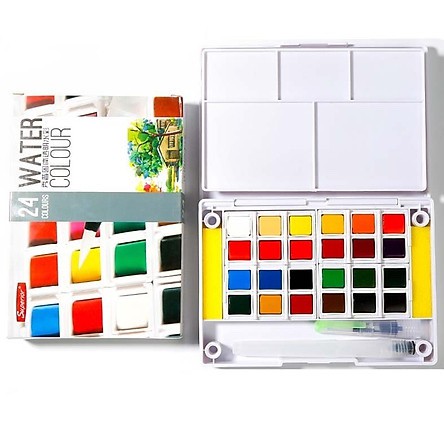 - Có kèm cọ nước, khay pha màu và bông mút vệ sinh tiện dụng giúp mang theo bên người khi ra ngoài hoặc đi học. Riêng bộ 36, 48 màu sẽ gồm 2 cây cọ nước với 2 đầu lông cọ khác nhau (một đầu dẹp và một đầu nhọn).