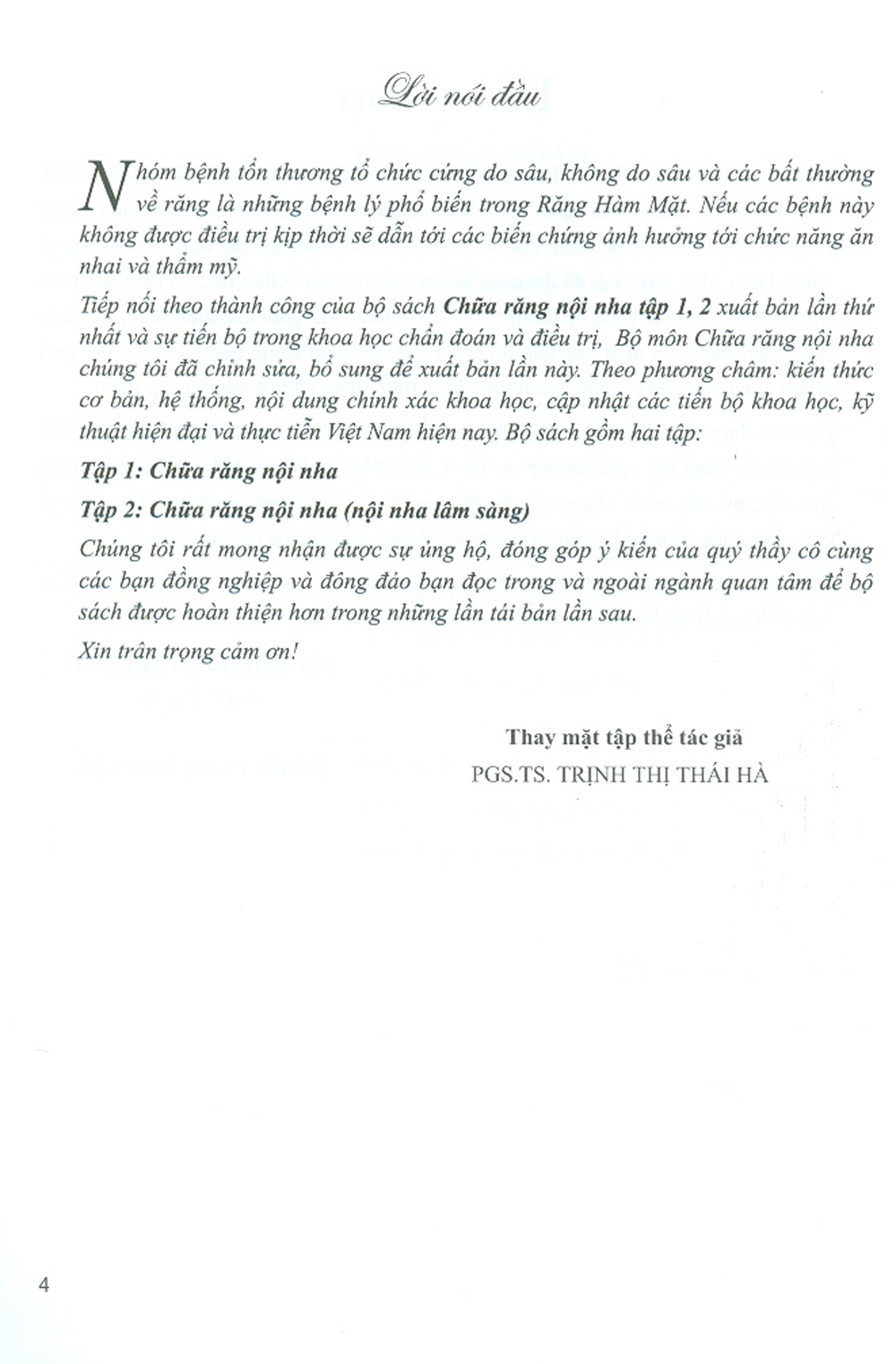 Tiếp theo thành công của bộ sách Chữa răng nội nha tập 1, 2 xuất bản lần thứ nhất và sự tiến bộ trong khoa học chẩn đoán và điều trị. Sách tái bản lần này theo phương châm: kiến thức cơ bản, hệ thống, nội dung chính xác khoa học, cập nhật các tiến bộ khoa học, kỹ thuật hiện đại và thực tiễn Việt Nam hiện nay.