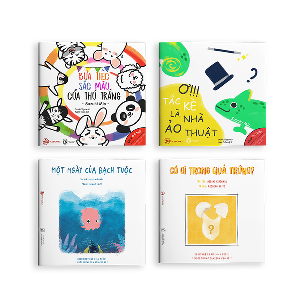 - Bộ sách Ehon Điều kỳ diệu của màu sắc gồm bốn cuốn: “Ơ!!! Tắc kè là nhà ảo thuật", "Bữa tiệc màu sắc của thú trắng", “Một ngày của bạch tuộc” và “Có gì trong quả trứng” là lựa chọn tuyệt vời cho trẻ từ 0 - 6 tuổi tại Nhật Bản. Mỗi cuốn lại là một câu chuyện nhỏ khác nhau, mang trong mình vai trò phát triển khả năng nhận biết màu sắc của trẻ.