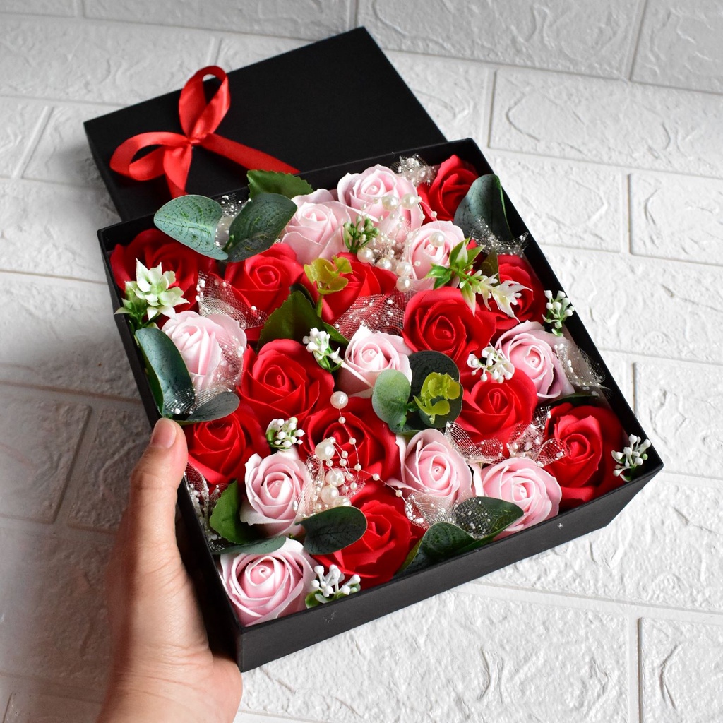 HỘP QUÀ TẶNG TỪ HOA HỒNG SÁP & HOA LỤA CAO CẤP LẠ MẮT
