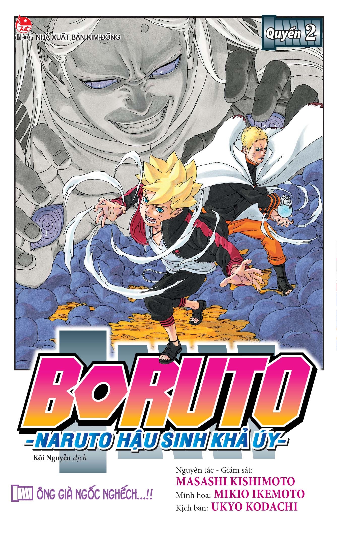 Boruto đã xuất sắc vượt qua vòng 2 kì thi tuyển Chunin. Cha của cậu - Naruto - đã dành lời khen làm anh chàng sung sướng đến nước mắt lưng tròng. Vậy mà ở vòng thi thứ 3, Boruto đã quyết ăn thua đủ bằng cách sử dụng nhẫn cụ bị cấm… Naruto thẳng thừng tuyên bố con trai anh mất tư cách thi đấu. Chuyện gì sẽ xảy ra!? MIKIO IKEMOTO “BORUTO hiện được đăng trên tuần san “Shonen Jump”, nhưng tốc độ ra mỗi tháng 1 lần. Nếu cho đăng tải truyện hàng tuần thì mỗi tuần cần phải có ít nhất 19 trang, 4 tuần của 1 tháng sẽ có 76 trang cả thảy! Trong khi nếu 1 tháng chỉ đăng tải 1 chương với số trang là 45 như hiện tại, thì khối lượng công việc vẫn chỉ bằng 60% so với việc cho ra mỗi tuần. Ở trường hợp của tôi, nội lên bản phác đã mất cỡ 1 tuần, hoàn thiện kịch bản chính mất tầm 20 ngày, thời gian còn lại dành ra tô màu, hay làm các tác vụ khác… Thế nên thông thường tôi sẽ mất tròn 1 tháng để hoàn thiện 1 chương. Vụ này không phải do tôi phát biểu, cũng chẳng biết ai đề xuất, nhưng công nhận BORUTO phát hành 1 tháng 1 chương như vầy đúng là dễ thở xiết bao…” UKYO KODACHI “Chúng ta đang sống trong thời đại biến đổi từng ngày. Hồi tôi còn nhỏ, mỗi nhà chỉ có 1 cái điện thoại, cũng không có những thiết bị không dây như bây giờ. Thời đó máy chơi game chính là chiếc đầu 4 nút huyền thoại, bao trùm thế giới là bầu không khí khó hiểu của “Chiến tranh lạnh”. Giờ thì điện thoại thông minh ai ai cũng có, internet phủ sóng khắp mọi nơi tựa như không khí vậy.” Nhưng rồi cũng sẽ đến ngày chúng trở thành hoài niệm thôi đúng không? Boruto và các bạn cũng thế. Đó là những cô cậu bé đang chiến đấu hết mình trong thời đại chuyển giao giữa cái cũ và cái mới. Mong mọi người sẽ luôn ủng hộ nhé!”