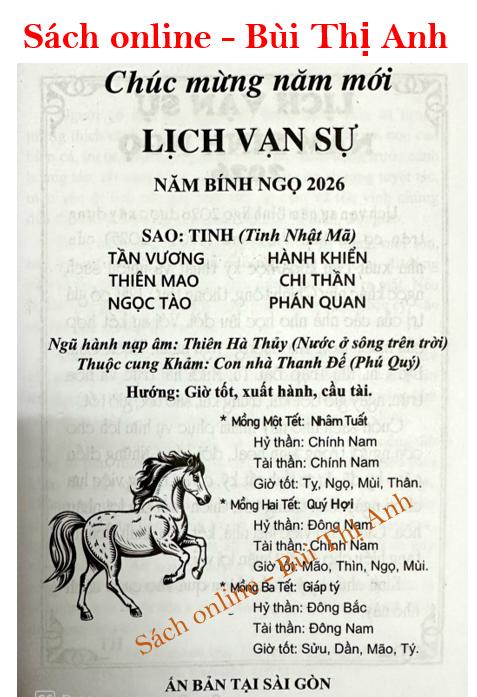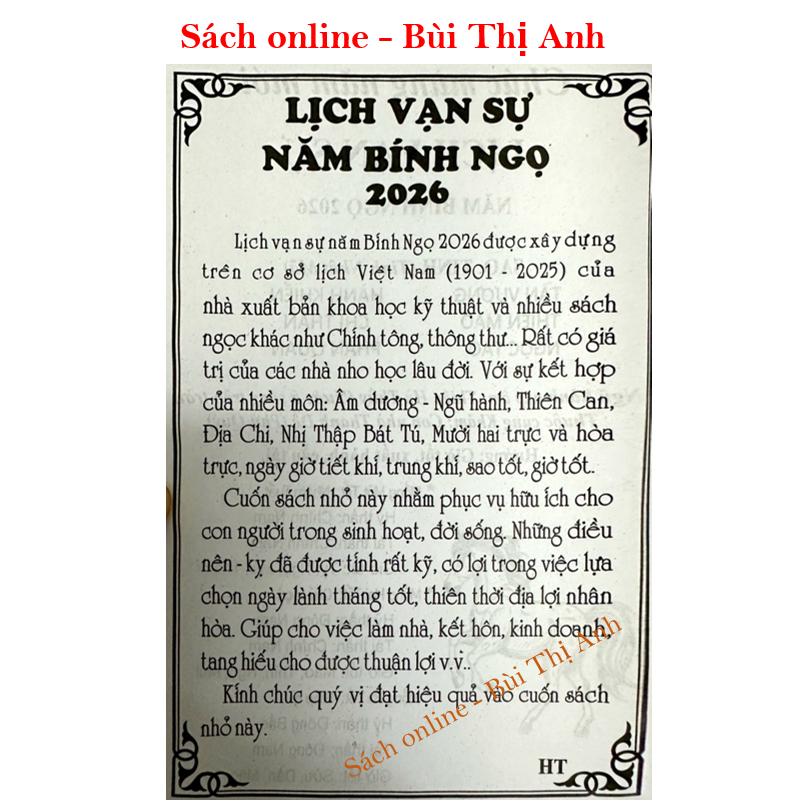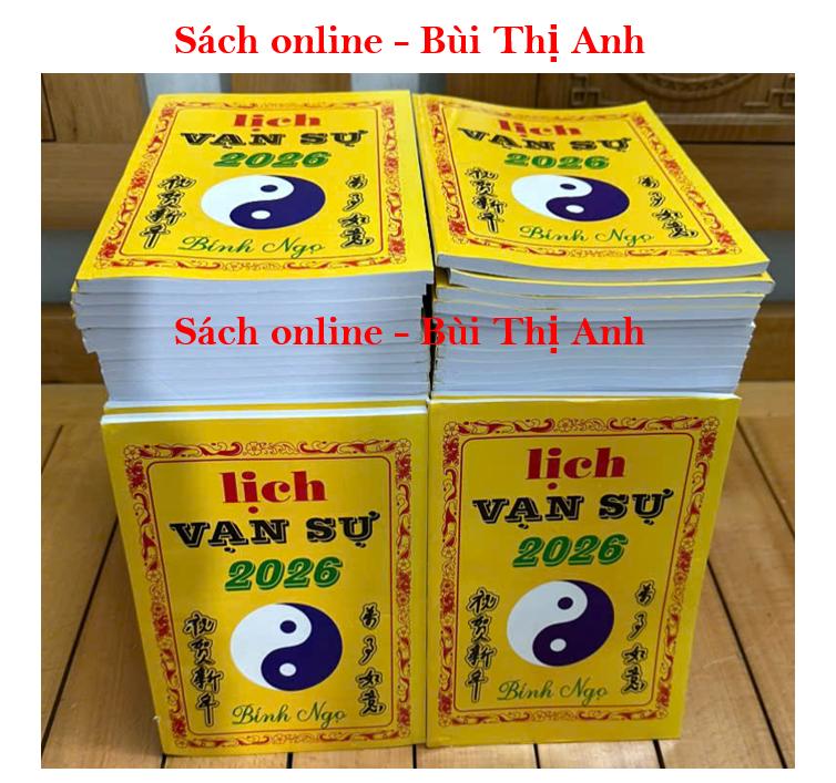Lịch Vạn Sự Năm Bính Ngọ 2026 theo lịch âm. Bạn có thể tra cứu ngày tốt, xấu, sự kiện của 12 tháng trong năm 2026. Sách cung cấp các ngày nghỉ lễ, lịch Tết 2026, các ngày rằm, mùng 1 hàng tháng và Tử vi 2026 của 12 con giáp rất chi tiết.