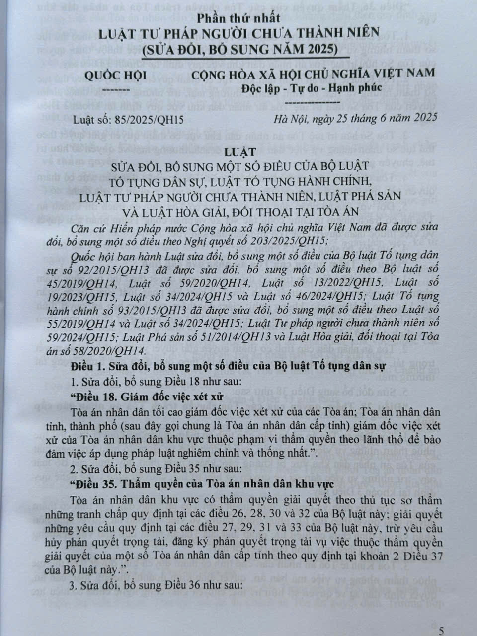 Ngày 25 tháng 6 năm 2025 tại Kỳ họp thứ 9 Quốc hội khóa XV, Quốc hội nước Cộng hòa xã hội chủ nghĩa Việt Nam đã thông qua Luật số 85/2025/ sửa đổi, bổ sung một số điều của Luật Tư pháp người chưa thành niên số 59/2024/QH15.