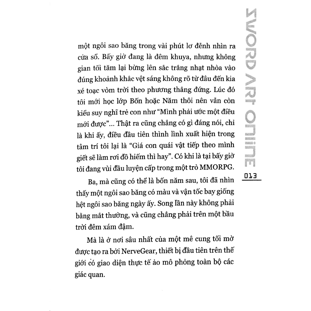 Sword Art Online Progressive 001 Sword Art Online được sáng tác nhằm mục đích ban đầu là dự cuộc thi sáng tác Light Novel, nên chỉ trong một tập nhân vật đã phá đảo xong thế giới SAO. Với Sword Art Online Progressive (hay SAOP), tác giả lội ngược dòng thời gian, đưa bạn đọc về điểm xuất phát, đi theo hành trình công phá tòa thành nổi Aincrad tuần tự từ tầng 1 trở lên. Lúc này, trò chơi tử thần SAO diễn ra mới hơn một tháng, mà 10.000 người chơi đã hao hụt mất 1/5. Một số game thủ hàng đầu đã đứng ra nhóm họp, để tìm cách đột phá lên tầng tiếp theo. Trên đường tới dự cuộc họp này, Kirito đã bắt gặp một người chơi nữ giữa lúc cô đấu tay đôi theo phong cách liều chết với một quái vật hùng mạnh. Tập 001 này kể về trận công phá tầng 1 và tầng 2, có sự góp mặt của một số nhân vật vốn chỉ nghe qua tên bên series SAO như thủ lĩnh Quân Đội Kibaou, nhà buôn tin Argo Chuột Cống, rồi Agil vào thời điểm trước khi anh nổi máu thương nhân, dĩ nhiên có cả Asuna của giai đoạn mới tập chơi game online. Chỉ mỗi Kirito vẫn là Kirito mà thôi. Chương “Điệu nhạc đêm vắng sao” sẽ cho chúng ta biết lí do Kirito được gọi là Hắc kiếm sĩ. Chương “Luân khúc kiếm đoản mệnh” thì kể về trận đánh boss tầng 2 và tâm sự u uẩn của một cậu thợ rèn!