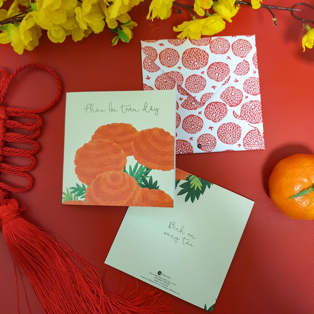 Giới thiệu Thiệp Tết vuông 12x12 SDstationery SẮC XUÂN hoa mai hoa vạn thọ đơn giản, mộc mạc