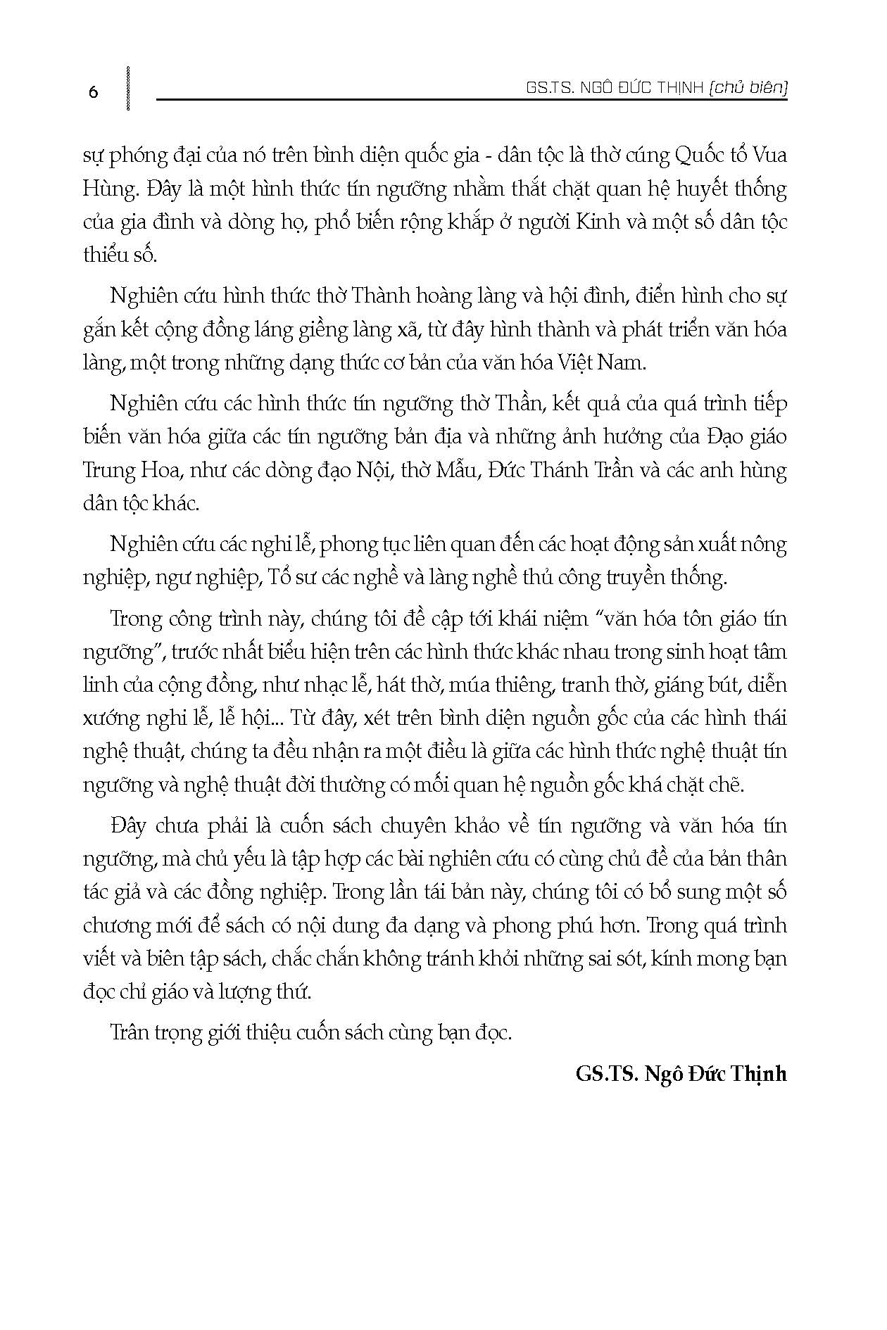 Quan điểm lý luận và phương pháp liên quan đến tín ngưỡng và văn hóa tín ngưỡng cũng như việc nghiên cứu một số tín ngưỡng dân gian cụ thể như thờ cúng Tổ tiên của các gia tộc, dòng họ, thờ Thành hoàng làng và hội đình, tín ngưỡng thờ thần, các nghi lễ, phong tục liên quan, các hình thức khác nhau trong sinh hoạt tâm linh của cộng đồng như: nhạc lễ, hát thờ, múa thiêng … qua đó thấy được mối quan hệ chặt chẽ giữa các hình thức nghệ thuật tín ngưỡng và nghệ thuật đời thường, phát huy mặt giá trị, mặt văn hóa của tôn giáo tín ngưỡng.