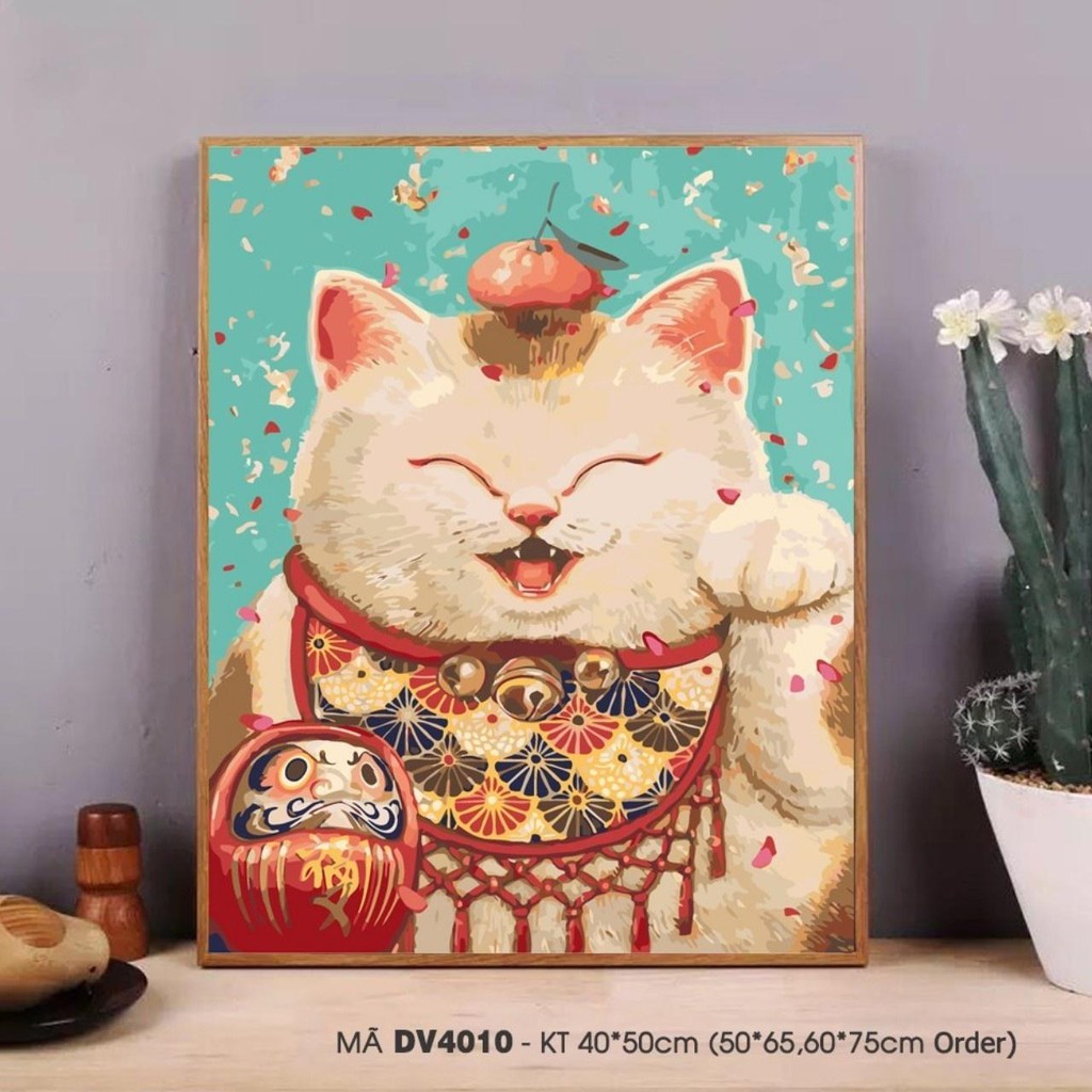 Giới thiệu Tranh sơn dầu số hóa rẻ,đẹp-tranh tô màu theo số- tranh mèo thần tài , Tặng khăn,khung gỗ 40x50-Moonshop