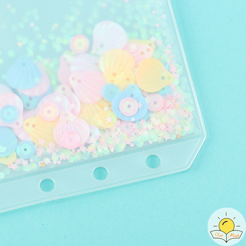 Túi zip phụ kiện sổ còng được trang trí lấp lánh bởi những kim tuyến nhũ, ánh ngọc hình vỏ sò...