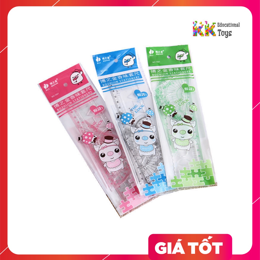 🍒 Bộ thước là màu trong suốt, nhiều họa tiết và được đựng trong túi hình nhân vật ngộ nghĩnh